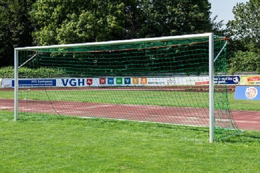 Porterías de fútbol para estadios 7,32 x 2,44 m en manguitos para suelo con construcción de arco de red EN 748