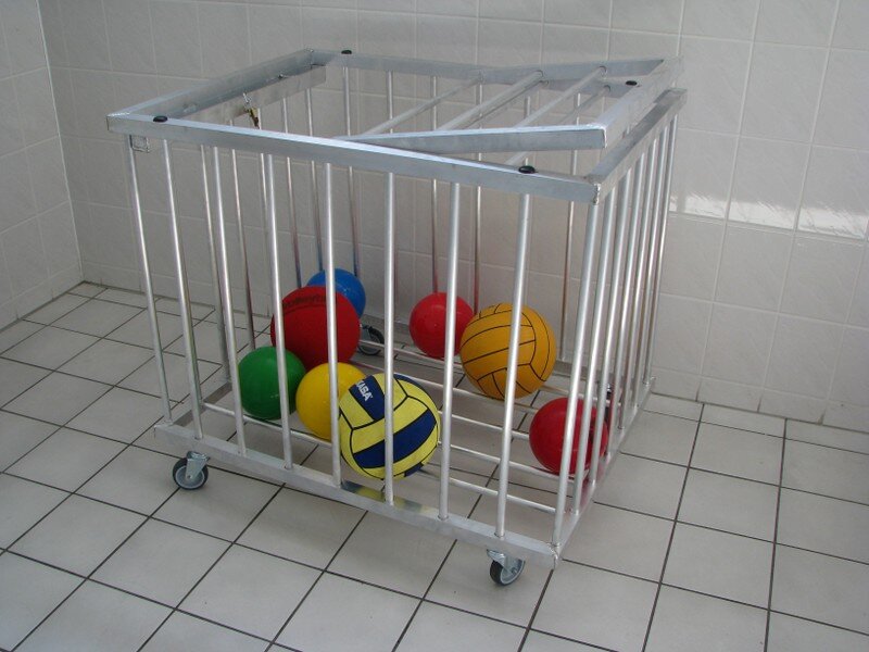 Portabalones carga cómodo y descarga de la carretilla de los balónes debido a la gran tapa. Dimensiones: 0,90 x 0,70 x 0,70 m, con rodillos de guía sólidos. Capacidad: aprox. 70 a 80 balones, dependiendo del tamaño.