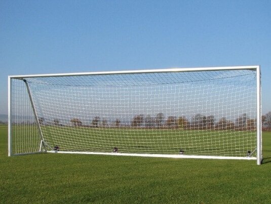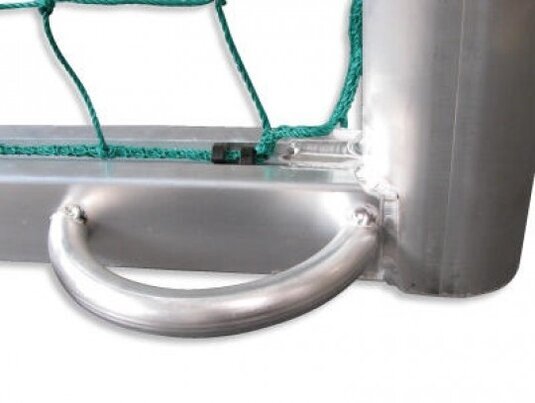 Perfil oval 120 x 100 mm de aluminio. La parte inferior de esta portería de fútbol está hecha de un perfil cuadrado de 80 x 80 mm. El color de esta portería de fútbol es brillante natural de aluminio. Como accesorio, ya están integrados en la entrega: Gancho de alimentación y rodillos de transporte (soldadas).